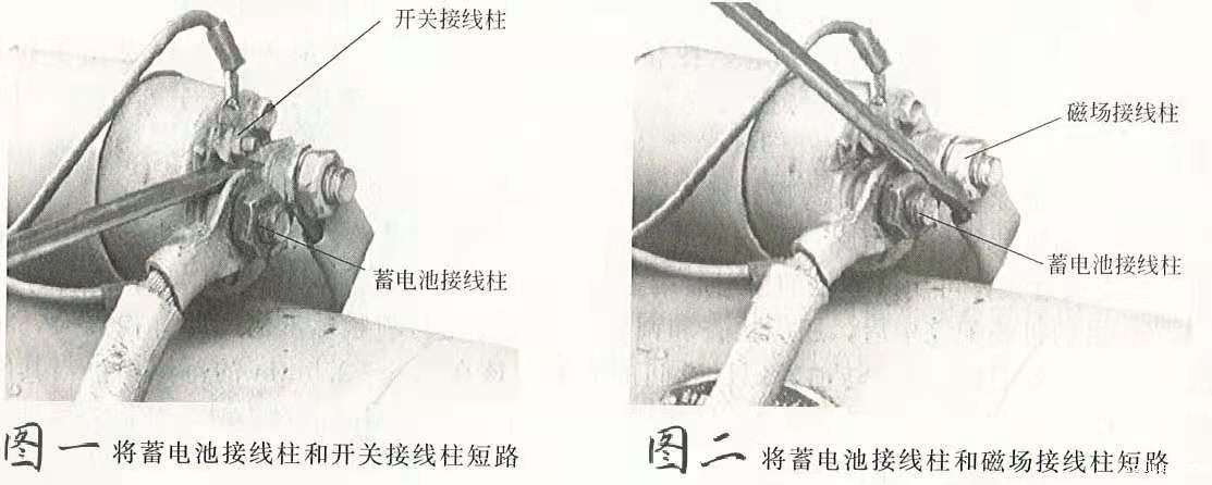 6.用旋具再将蓄电池接线柱和磁场接线柱短路。若启动机正常运转,则说明电磁开关内部有故障,应拆下电磁开关,检查电磁开关内部的活动触头和两个静触头的烧损情况及磁力线圈是否烧损等。如启动机仍不运转,且在短路时无火花出现,则说明启动机内部出现断路故障;若火花出现,则说明启动机内部出现短路现象,应将启动机拆下后进行修理。