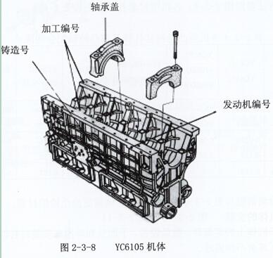 5.主轴承盖须与机体配对,并且档别也必须与机体的档位对应,不能互换。每个机体侧面都铸有铸造号,底面打有机体加工号,侧面上打有发动机编号;每个轴盖底面上打有加工和安装序号及安装方向(箭头)。参阅图2-3-8及图2-3-9。