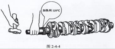 1.曲轴正时齿轮与曲轴小头端采用过盈配合,安装时用电磁感应加热器(或其它方式)将曲轴正时齿轮加热到120 0C左右,根据各种机型曲轴的不同定位要求,销钉定位有:YC6105ZLQ、YC6108ZLQB、YC6L。属键定位有:YC4110、YC4112、YC6105QC、YC6108QC。靠工装定位的有YC6112机)迅速将加热后的曲齿装入曲轴小头端,保证把齿轮压到台肩贴合。如图2-4-4。