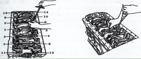 (5) 装主轴承盖参见图2-3-8的要求安装,并用铜锤敲到位。主轴承盖螺栓螺牙上可加适量机油,并用手自由拧入几牙。用扭力板手分三次由中间向两端紧固。如图2-4-9。