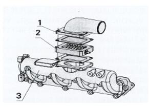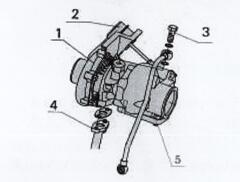 松脱增压器进油管3、回油管4及4只底座紧固螺母5(注意这4个螺母为耐热材料制成的特殊螺母,不能丢失或错装)和增压器两端连接管即可把增压器取下。
