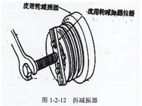 注意:在拉拔皮带轮减振器时,必须用专用拉拔器靠在皮带轮减振器的内圈上加力,以免损坏减振器内外圈之间的橡胶层,造成事故隐患。图1-2-12。