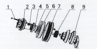 1、螺栓Ml0×75 2、空调皮带轮 3、螺栓 4、连接轴 5、圆柱销 6、硅油减振器 7、皮带轮 8、曲轴齿轮 9、曲轴
