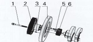 1、皮带轮螺栓 2、皮带轮 3、圆柱销 4、硅油减振器 5、螺栓(内六角螺钉) 6、曲轴正时齿轮