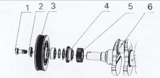 1、皮带轮压紧螺栓 2、曲轴头垫片 3、减振器 4、机油泵驱动齿轮 5、曲轴正时齿轮 6、曲轴
