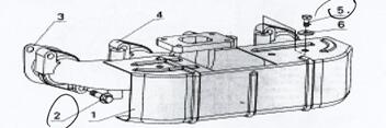 拆卸机油集滤器组件,只需把集滤器紧固螺栓4及集滤器支架螺栓5松脱即可。注意:在使用过程中集滤器支架容易破裂,注意检查。