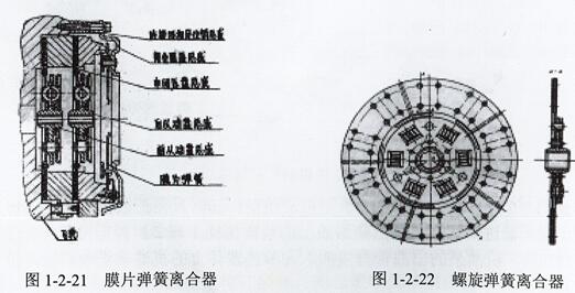 在拆卸离合器前,先拆除飞轮壳或飞轮盖板上的紧固螺栓(图1-2-20),把飞轮壳或飞轮壳盖板取下。拆下离合器压盘总成与飞轮联接螺栓1和2即可把离合器压盘总成及离合器从动盘总成拆下。注意:产品出厂时,厂家对曲轴、离合器总成及飞轮作过整体平衡。因此,在拆卸时,特别注意其连接方式及其平衡块的安装位置,最好能打上安装标识,以免装复时装错、装乱,造成故障隐患。目前配用螺旋弹簧离合器或膜片弹簧离合器(图1-2-21图1-2-22),一般情况下,这些离合器都能互换使用。