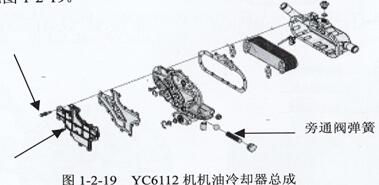 对于内置式散热器,根据不同机型不同结构分别把散热盖上的进出水接头、增压器进油管接头、高压油泵机油进油管接头或压气机进油管接头及散热器盖上的紧固螺栓拆掉即可取下散热盖,然后将机油冷却器芯拆下。提示:在拆YC6L机散热器时最好能先拆掉起动机和气泵。机油散热器一般都有旁通阀,其开启压力为0.55MPa。参见图1-2-18。
