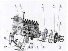 1、喷油泵 2、螺栓Ml0×90 3、联接板 4、定位套5、喷油泵齿轮 6、喷油泵正时调整板 7、螺栓Ml0×1×308、螺栓Ml0×55 9、螺栓Ml0×40 10、支架子 11、托架12、螺栓Ml0×20 13、断油管组件