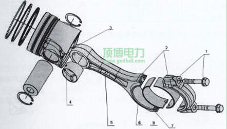 1面(连杆螺栓松动此面光亮) 2 加工编号标记处、3 集油口 4油槽 5连杆安装方向标记处(向前) 6少数连杆在7处标加工编号 7大小头重量(或差)标记处