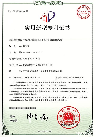 - 祝贺我公司荣获柴油发电机降噪除烟除味系统专利证书 2018-08-16